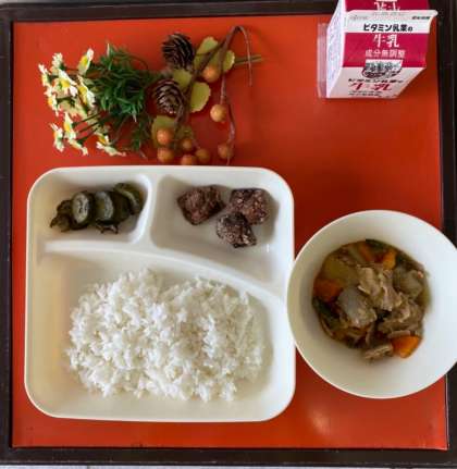 今日の給食は、くじらの竜田揚げ・豚肉とじゃがいもの煮物・きゅうりの赤しそあえ・ご飯・牛乳でした。