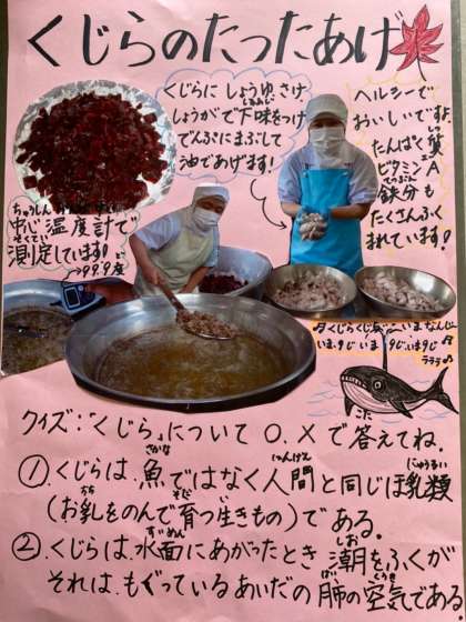 今日は、くじらにしょう油、生姜等で味をつけて、でんぷんをまぶし、油で揚げた竜田揚げが登場しました。
