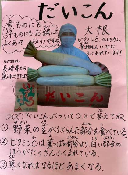 *今日の給食クイズの答えは、(1)×、(2)○、(3)○でした。