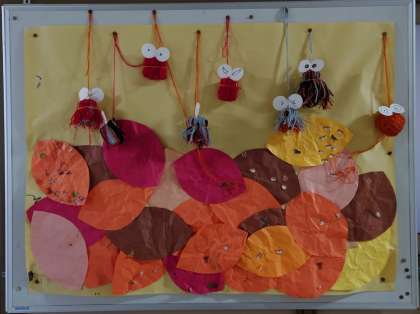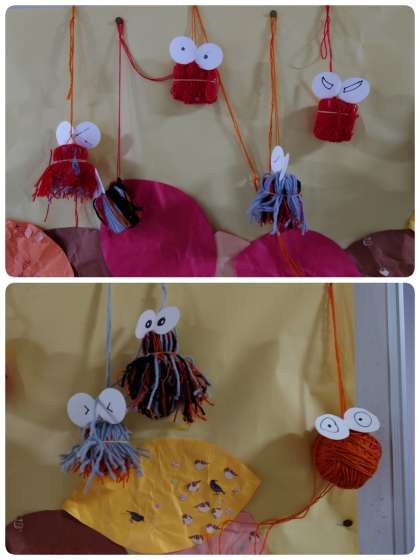 なかよし学級の掲示板には、かわいいミノムシがぶら下がっています。いろいろな色の毛糸を使って作りました。目の表情がそれぞれ違います。毎回工夫がいっぱいの掲示物です。