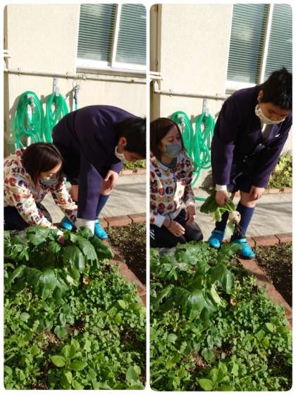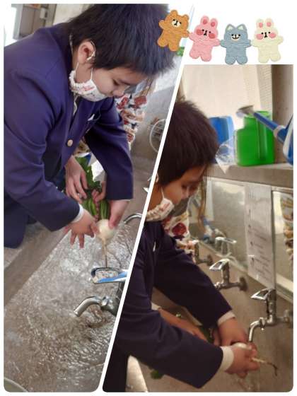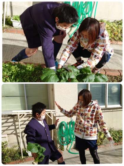 なかよし学級の子ども達が育ててきたカブの収穫をしました。とてもりっぱなカブに生長しました。収穫してから水できれいに洗って土を落としました。みずみずしくておいしいそうです。
