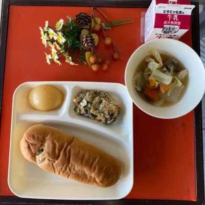 今日の給食は、スープ煮・ほうれん草のグラタン・白桃(缶)・レーズンパン・牛乳でした。