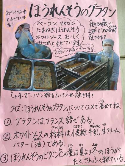 *今日の給食クイズの答えは、(1)○、(2)○、(3)○でした。