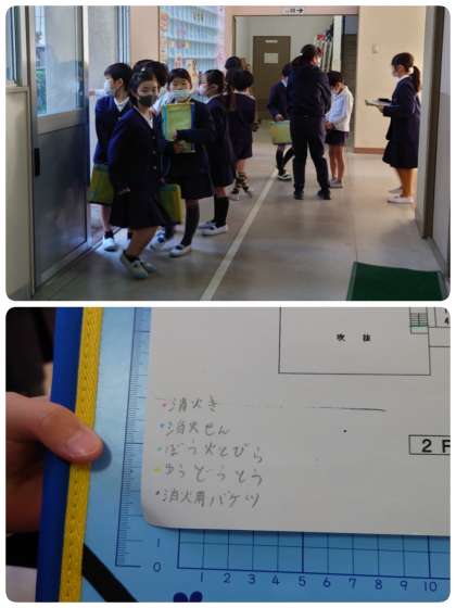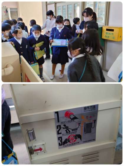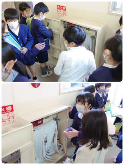 3年生が学校中の消防設備を調べていました。消火器・消火栓・防火扉・誘導灯・消火用バケツがどこにあるのか、校舎図に書き込んでいきました。職員室の前を通りかかった時に、消火栓の中も見ました。長いホースが折りたたまれて入っています。使い方の説明書きも見つけました。先生の説明もしっかり聞いて楽しそうに学習していました。