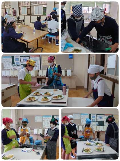 どのグループもみんなで役割分担をし、協力して調理をしていました。仲良く作業しているので本当に楽しそうです。包丁の使い方もなかなか上手で、洗い物も手際よくできていました。段取りよく2つの料理が完成。お皿に盛りつけて、少人数に分かれて試食しました。自分達で作った「ジャーマンポテト」と「ピーマンと小魚の炒め物」をおいしそうに食べていました。