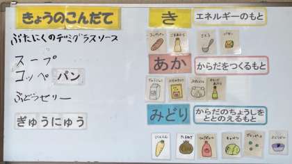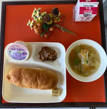 今日の給食は、豚肉のデミグラスソース・スープ・ぶどうゼリー・コッペパン・バター・牛乳でした。