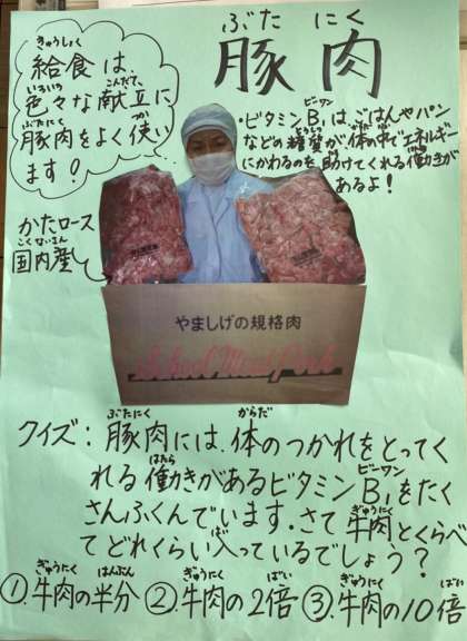*今日の給食クイズの答えは、(3)(牛肉の10倍)が正解です。