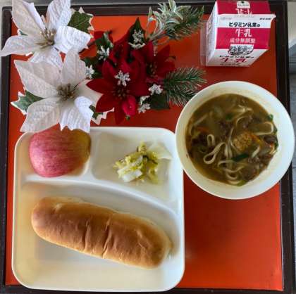 今日の給食は、カレーうどん・白菜の甘酢あえ・りんご・おさつパン・牛乳でした。