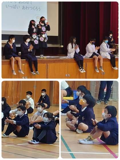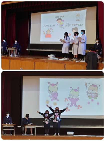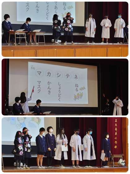 今日の児童集会は、けんこう委員会の「冬もマカシテネ」の舞台発表でした。これから流行する冬の感染症予防について大切なメッセージを劇にしました。