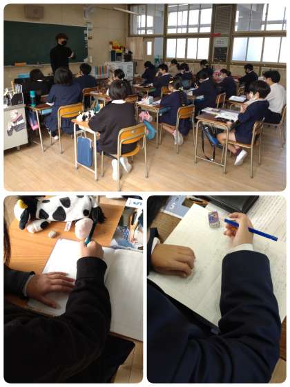 最初に2つの作文を書きました。1つ目は「友達のだれかが、他の友達のためにこっそりとしてくれていること」、2つ目は「自分が、こっそりと誰かのためにしていること」でした。それぞれ制限時間5分で、最初は何をどう書いたらいいのか悩んでいた子も、担任の先生の補足説明を聞きながら、1つ2つと書き出しはじめました。