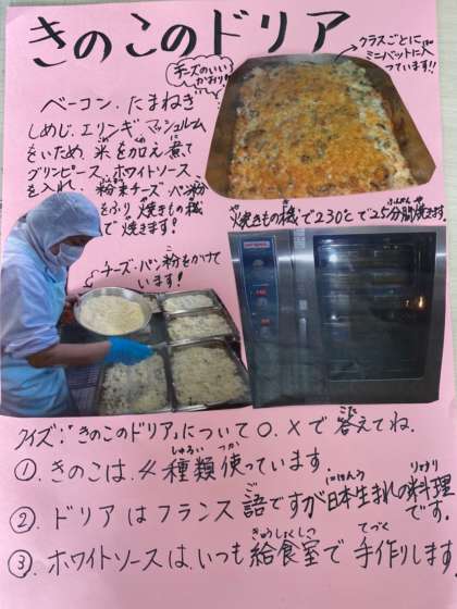 今日のきのこのドリアには、しめじ・エリンギ・マッシュルームの3種類のきのこが使われていました。中でもエリンギは、もともと日本にはなく、イタリアやフランス、ロシアなどで山や野に自然と生えているきのこです。日本では、平成5年に愛知県で初めて栽培に成功し、それ以来、食材として使われるようになりました。