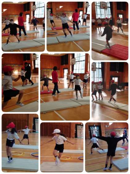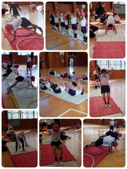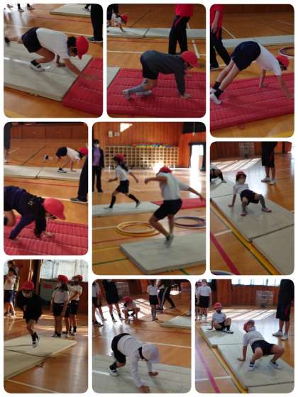 今日の体育の学習は、前回に続いてマット運動でした。最初にマット運動につながるいろいろな体の動きをしていきました。スキップしたりクマさん歩き(四つんばいで歩く)をしたり、ジャンプをしてからダッシュしたり、次々変わる運動に子ども達は夢中になって取り組んでいました。体がほぐれてから、前転と後転の練習に入りました。最後のポーズまでピシッと決めてフィニッシュ!!「できたぁ!!」と笑顔でうれしそうにしている子ども達です。