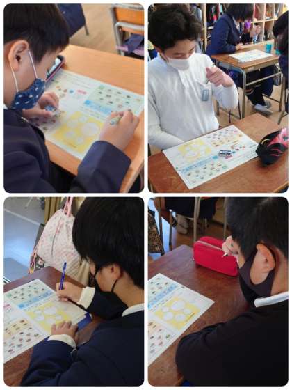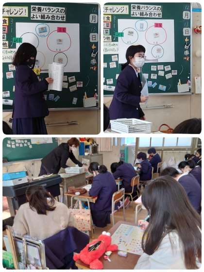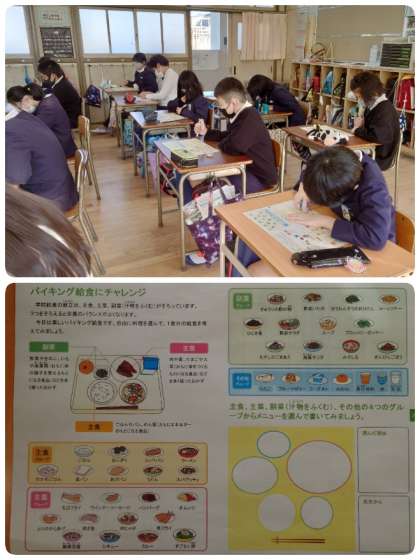 5年生の栄養学習のめあては、「どんな食べ方がいいのかな」でした。五大栄養素(炭水化物・脂質・たんぱく質・無機質・ビタミン)の働きを確認してから「バイキング給食にチャレンジ」の学習に入りました。主食・主菜・副菜とその他の比が、3:1:2になるように自分の好きな献立を考えました。和・洋・中を考えてメニューを決めている子もいました。最後に考えたバイキング給食を発表しました。みんなバランスよくメニューを選ぶことができていましたよ。