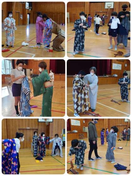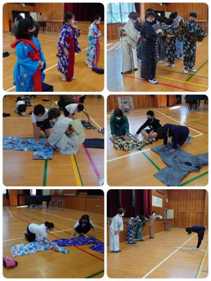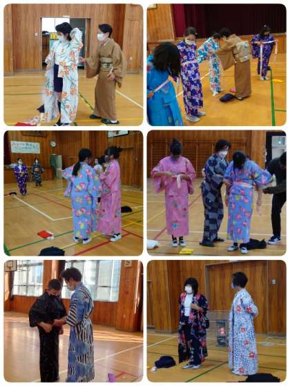 さあ、いよいよ待ちに待った浴衣の着付体験です。身長に合わせた浴衣を用意してくださっていました。着付士(師)の先生達は、とっても優しくて、一つ一つ丁寧に教えてくださいました。子ども達の目はキラッキラ!!ワクワクしている気持ちが伝わってきました。記念写真を撮りましたが、子ども達のほっぺがピンク色になっていて、すごく楽しい体験学習ができたのだと伝わってきました。最後は着物のたたみ方も教えていただきました。