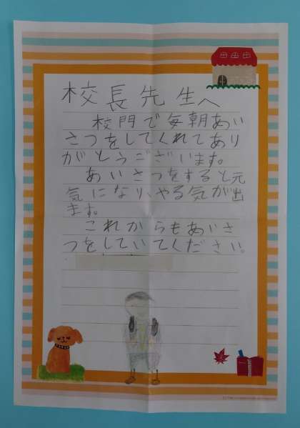 校門で毎朝あいさつをしてくれてありがとうございます。あいさつをすると元気になり、やる気が出ます。これからもあいさつをしていてください。」