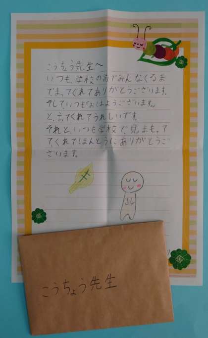 いつも、学校の前でみんなくるまで、まってくれてありがとうございます。そしていつも「おはようございます。」と、言ってくれてうれしいです。それと、いつも学校で見まもってくれてほんとうにありがとうございます。」