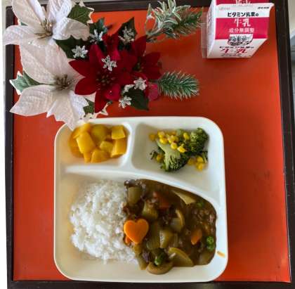 今日の給食は、冬野菜のカレーライス・ブロッコリーとコーンのサラダ・黄桃(カット缶)・牛乳でした。
