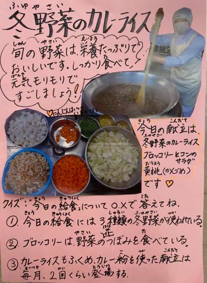 今日のカレーには大根とレンコン、サラダにはブロッコリーの冬野菜が使われました。冬野菜には他にも白菜やほうれん草、小松菜等がありますが、その時期に摂れる旬の野菜は栄養素がたっぷり含まれ、味もい美味しいです。また多く収穫できるので、値段も安いのが特長です。