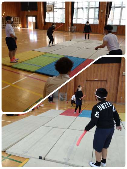 今日の4時間目、5年生が講堂でニュースポーツの1つであるスポーツチャンバラに取り組んでいました。