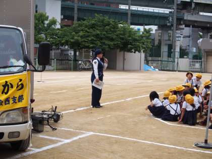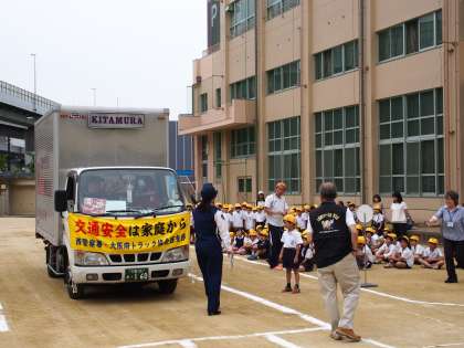 トラック協会の協力による自転車の巻き込み事故や、運転者の死角についての説明があり、参観された保護者の方に子どもの安全を守るためのお話もありました。