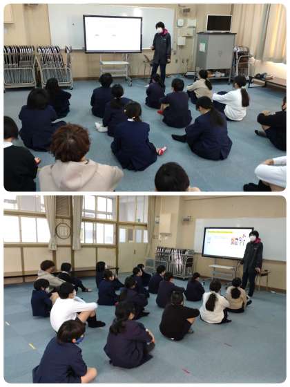 最初に本校養護教諭から、これまでと同じく感染症予防について保健指導を行いました。ウイルスが体に入らないようにするとともに、ウイルスに負けない強い体を作るために気をつけてほしいことなどを話しました。