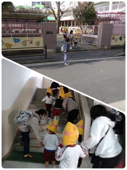 今日の昼休み、九条幼稚園が津波発生時の避難訓練として、本校の西校舎4階に避難してきました。