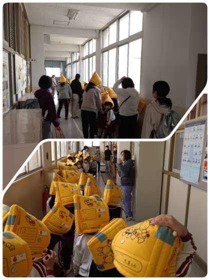最初に園庭に集合し、そのあと本校の給食室側の通用門から入り、講堂の階段を使って4階の図書室前廊下に集まりました。