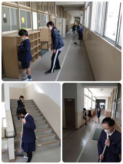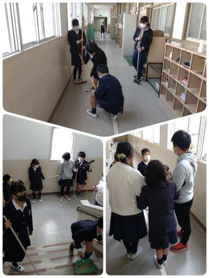 1〜6年生までで編成されたたてわり班で校内を掃除しますが、回を重ねるごとに連携して掃除に取り組むことができるようになっていました。低学年も、中学年や高学年のお兄ちゃん・お姉ちゃんの動きを見ながら一生懸命ほうきを動かしていました。