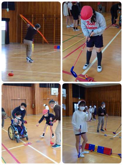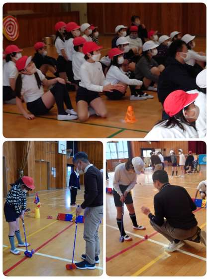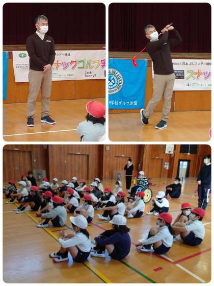 2月1日(火)、プロゴルファーの上平 栄道(うえひら まさみち)プロと、日本高等学校・中学校ゴルフ連盟の井上さん、日本ゴルフツアー機構の山田さんに来ていただき、3・4年生の子ども達にスナッグゴルフを教えてもらいました。
