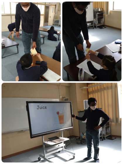 単語を書く練習のあと、大型テレビに次々と映し出されるイラストを見ながら「ホワイト!」「イエロー!」「ジュース!」と元気な声で発表していました。また、プリントが終わった時には「終わった!」ではなく、「フィニッシュ!」という言葉が自然と口から出ていて、今日も楽しく英語に親しむことができました。