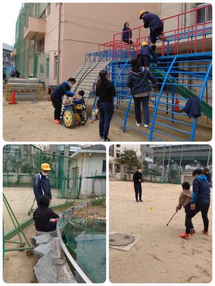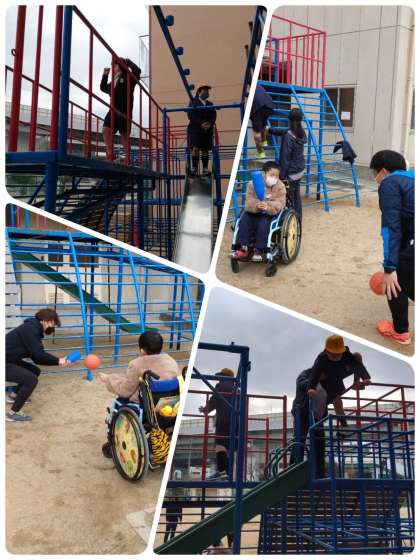 まずは運動場で、運動遊びを行いました。固定遊具で遊んだり、校庭を歩いたり、また道具を使って遊んだりしながら、楽しく体を動かしました。