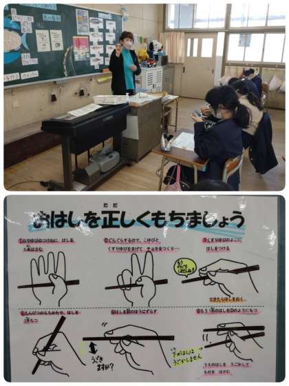 今日のテーマは「魚について知ろう」という内容で、最初に魚の栄養について学習しました。そして、より魚に興味を持てるよう、魚の名前クイズを行いました。鮪や鰯、鮭など漢字で書かれた魚の名前を順番に答えていきましたが、もともと魚が好きな児童が多かったので、みんなスラスラと読めていました。次に、より魚を上手に食べることができるよう、箸の正しい持ち方についても復習しました。