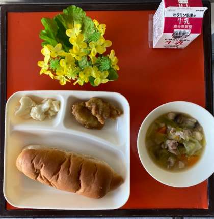 今日の給食は、白身魚のフリッター・洋風煮・カリフラワーのサラダ・黒糖パン・牛乳でした。