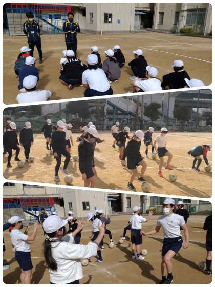 今日の2時間目、5年生が外部講師によるサッカー教室に取り組みました。