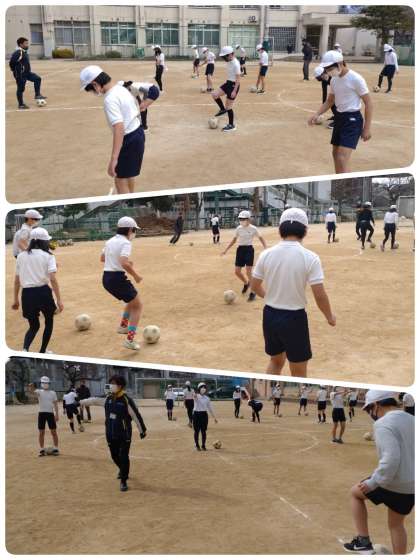 2時間目の5年生に引き続き、3時間目に6年生が外部講師によるサッカー教室に取り組みました。
