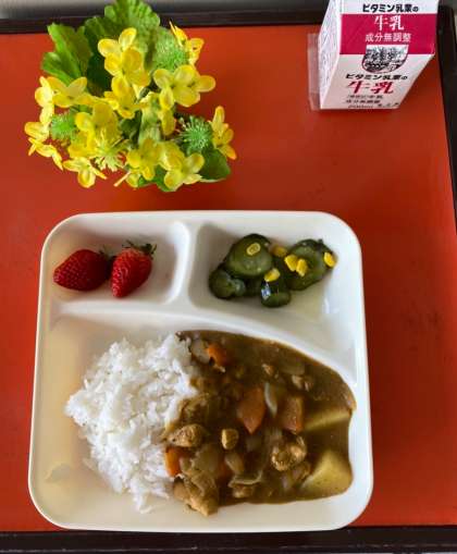 今日の給食は、チキンレバーカレーライス・きゅうりとコーンのサラダ・いちご・牛乳でした。