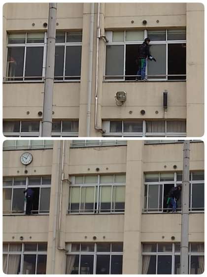 運動場で4・5年の体育の授業を観ていたときに、ふと上を見上げると3階の教室の窓の外側をきれいにしてくれていました。さすがプロ。とても手際よくて、みるみるうちに窓がきれいになっていきます。これで、もうすぐ卒業を迎える6年生も、一層きれいになった教室で気持ちよく過ごすことができます。