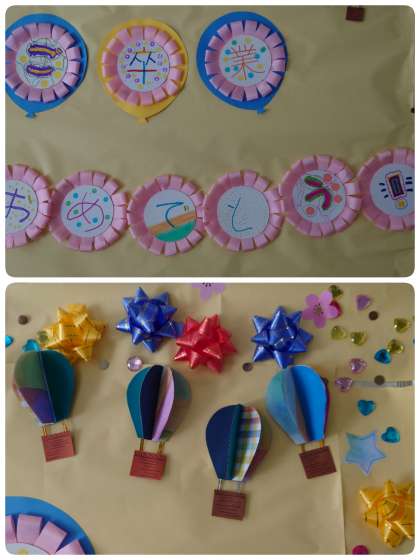 低学年は星形や花形の色鮮やかなシールをたくさん貼り、高学年はロゼッタ風の飾りの中に割り当てられた文字をおしゃれに描き込み、みんなで1つのメッセージに仕上げてあります。6年生にありがとうの気持ちをいっぱい込めました。