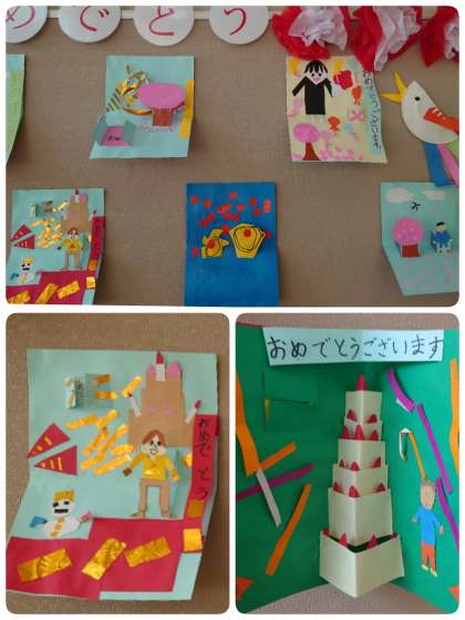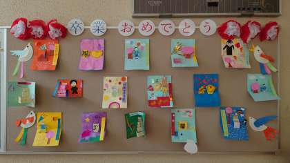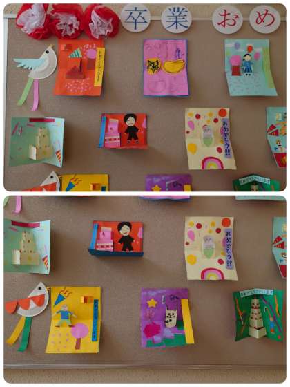 学校中の掲示板が、6年生への「卒業おめでとう!」バージョンになってきました。各学年、心を込めて作っています。今日はまず玄関の掲示の紹介です。4年生が、飛び出すカードを作りました。いろいろな物がカードを開けたときに飛び出すように工夫してあります。