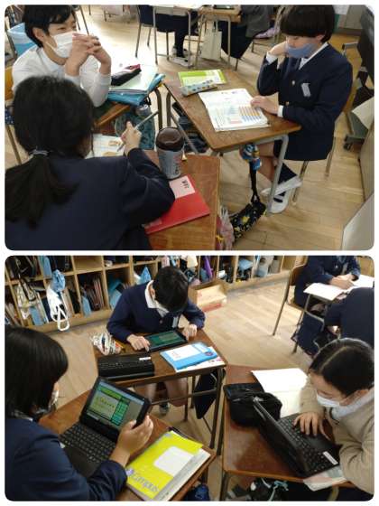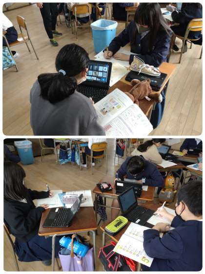 2〜3名のグループになって、教科書の最後に載っている問題を問いたり、教育情報利用パソコン(1人1台学習者用端末)を使って発展的な問題にチャレンジしたりしていました。