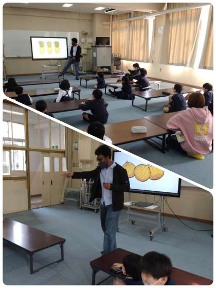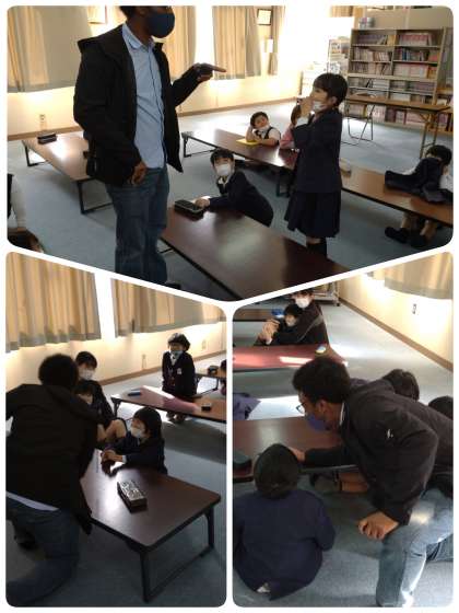 今日の5時間目、1・2年生が多目的室で英語活動に取り組みました。