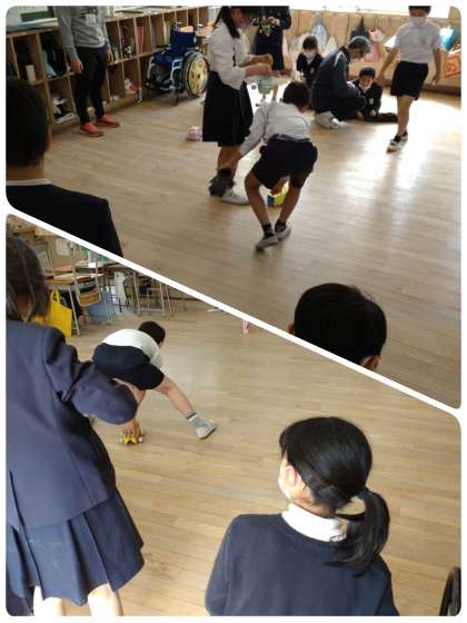 タイヤとタイヤをゴムで結んで自走する車ですが、それぞれが車体や飾りを工夫していました。勢いよく前へ飛び出す車もあれば、弧を描いて自分の所に戻ってくる車や毎回違う方向に進む車もあり、子ども達は夢中で自分の車を追いかけていました。