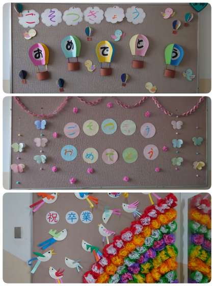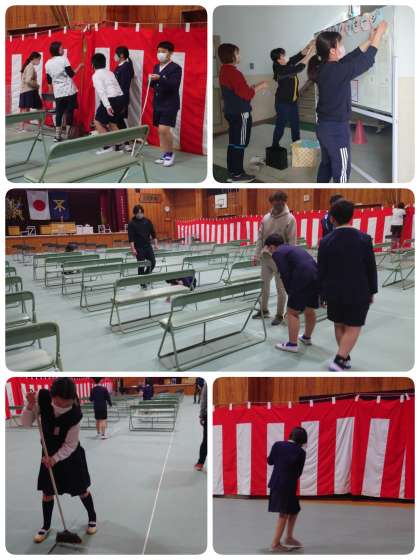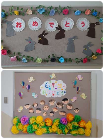 6時間目、5年生が卒業式の準備をしました。明日の卒業式のために、隅から隅まできれいに掃除をしました。卒業生や保護者が座る椅子もきれいに並べました。学校中、「卒業おめでとう」のメッセージでいっぱいです。