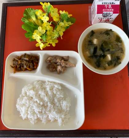 今日の給食は、鶏肉のしょう油マヨネーズ焼き・みそ汁・きんぴらごぼう・ご飯・牛乳でした。