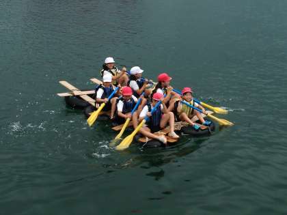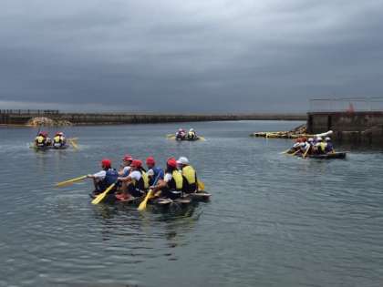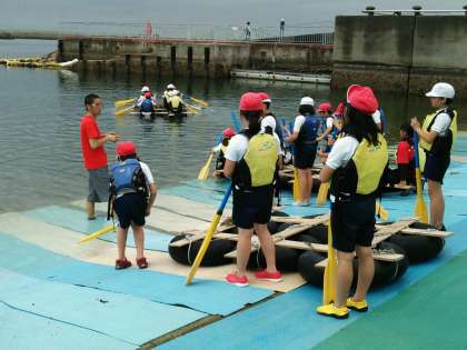イカダが完成し、海洋センターの桟橋から出港です。みんなで力を合わせて漕ぎ出しました。どのイカダも順調に進んでいきました。雨は降ったり、やんだりですが、みんな元気いっぱいです。