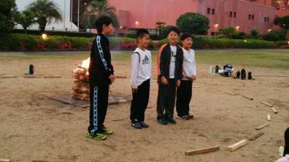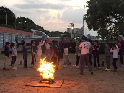 心配された雨も上がり、予定どおりキャンプファイアーを行いました。ボランティアリーダーの応援もあり、みんなで楽しく盛りあがりました・
