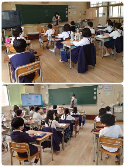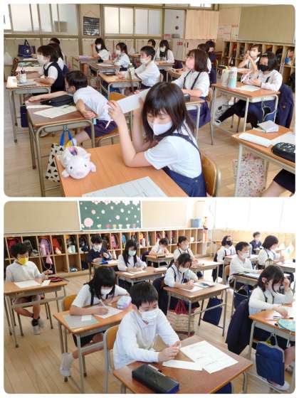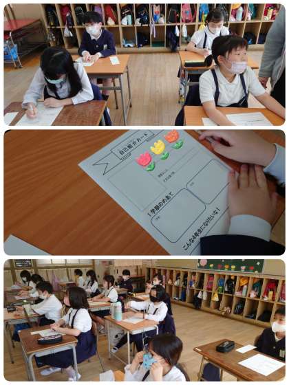 4年生は、自己紹介カードと日直の名札を作っていました。自己紹介カードには、「自分の得意なこと」「好きな食べ物」「1学期のめあて」「こんな4年生になりたいな!」などを書き込みました。カードにどんなことが書いてあるのか楽しみです。