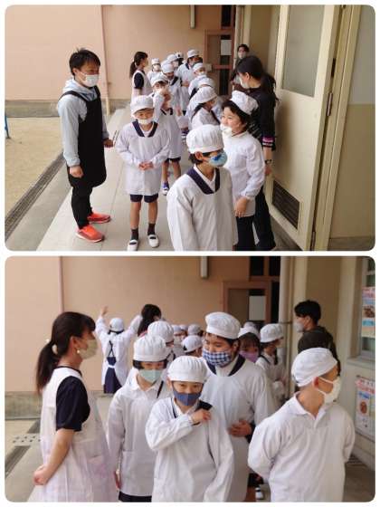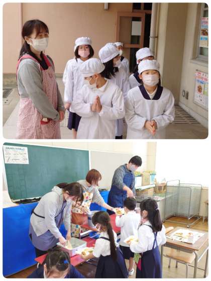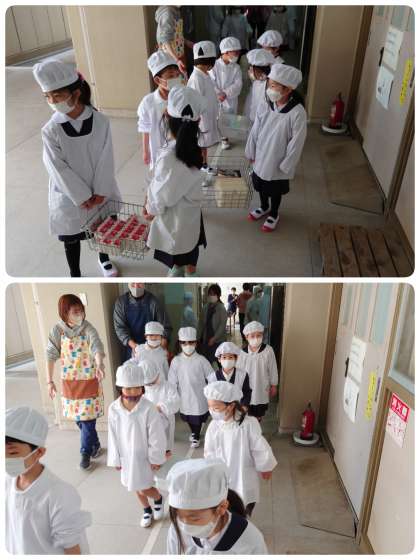 今日の給食は、入学のお祝い献立で、カツカレーライス・フルーツゼリー・牛乳でした。1・2年生は、一緒に給食当番をして、ランチルームでいただきます。お行儀よく食べていました。どの学年もたくさんの子どもがお代わりをしていました。今年度からおかずが冷めないように、全学年二重食缶を使用しています。いつでもホカホカのおかずを食べることができますよ。