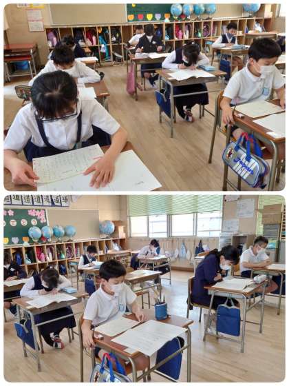 今日は、大阪府の取組「すくすくウォッチ」というテストとアンケートを実施しました。5年生は教科(国語・算数・理科)の問題とわくわく問題(教科横断型問題)とアンケート、6年生は、わくわく問題とアンケートに取り組みました。