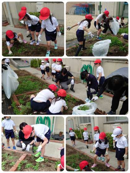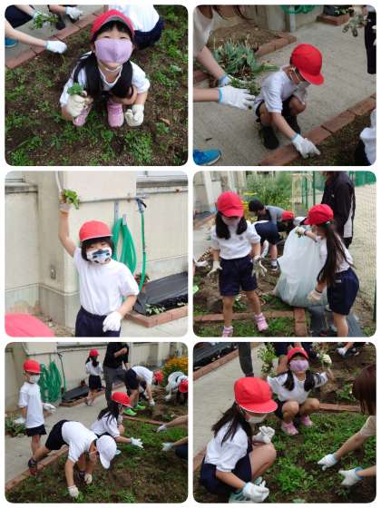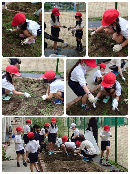 3時間目に、1・2年生が学習園の草抜きをしました。お友達と協力して、仲良く活動していました。1年生はいろいろな種類のお花を、2年生はサツマイモを育てます。